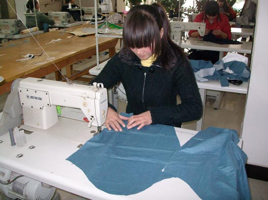 五、工作服的縫制:在針距密度中規定明線(包括不見明線的暗線)的針距,每3cm 14—18針。面料的品種很多,為保證產品的外觀和牢固,不同的面料應選不同的針距。如硬質面料的針距可以稀一點,質地松軟的面料針距可以密一點??p制部位的線路不準隨便彎曲,要符合工作服的造型的需要;線路要整齊,不重疊,無跳針、拋線,針跡清晰好看,縫制的起止回針要牢固,搭頭線的長度要適宜,無漏針、脫線現象,縫線松緊要與面料厚薄、質地相適應。