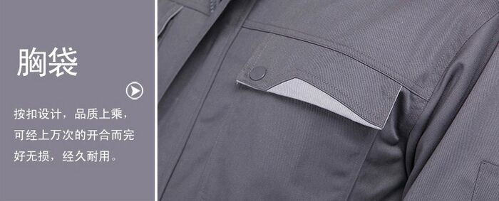 維修工作服以淺灰色為主色,口袋處用下搭式設計,黃色拼接,袖口做工精細,走線嚴密,結實耐磨時尚插袋,精細袖口,精致筆袋,松緊式下擺。