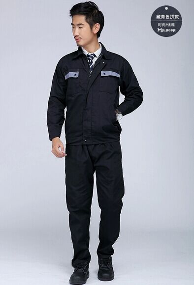 JL-QD260東莞廠服以藏青色為主色,胸前采用灰色撞色拼接,走線細致,實用性強。左中腰間口袋均采用雙層設計,傾斜線條,穩重大氣 走線細致,精細袖口,精致筆袋,夾克式下擺