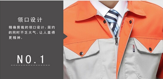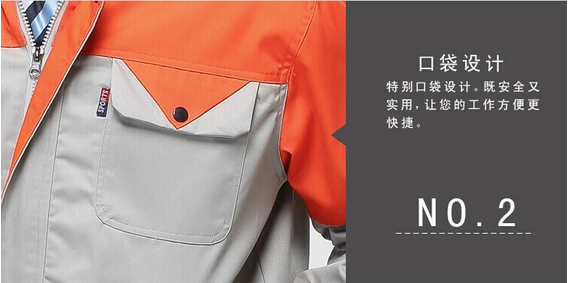 JL-QD253東莞工衣以藏藍色為主色,胸前衣兜采用紅色撞色拼接,走線細致,實用性強。左中腰間口袋均采用雙層設計,傾斜線條,穩重大氣